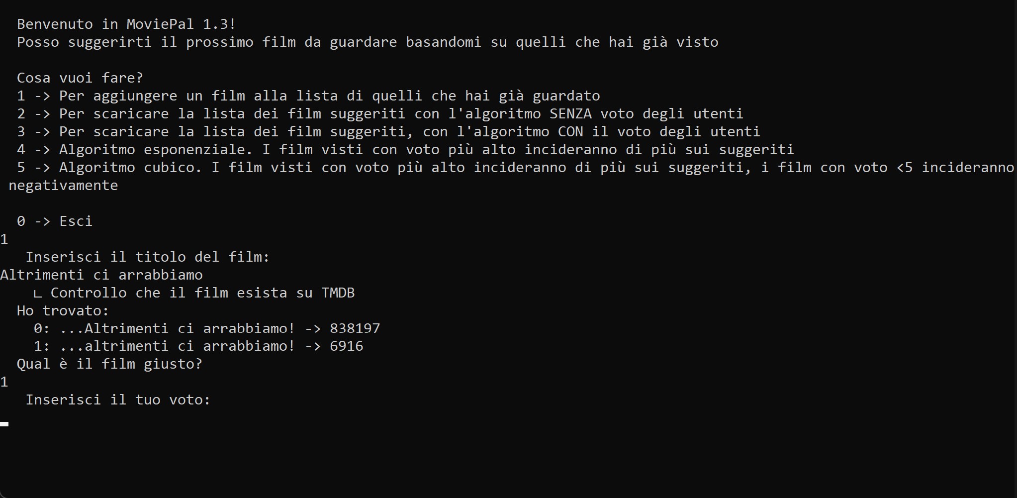 MoviePal è uno script in Python per il suggerimento dei film. Basandosi sui film visti e sul voto che l'utente ha dato ad ognuno di essi, MoviePal suggerisce una lista di film (utilizzando le API di TMDB) e li ordina per "affinità". Il calcolo dell'affinità è dato da 4 algoritmi diversi, che tengono traccia in modo diverso del voto assegnato ad ogni film visto e dalla quantità di volte che un film viene suggerito. Lo script tiene traccia dei film visti e suggeriti. L'interfaccia è minimale. Il nome, "MoviePal", è stato generato da ChatGPT!
