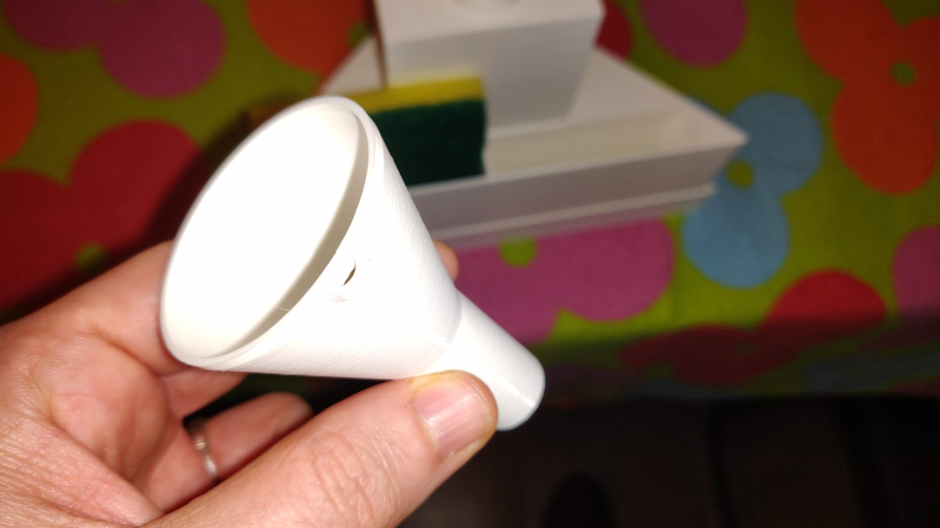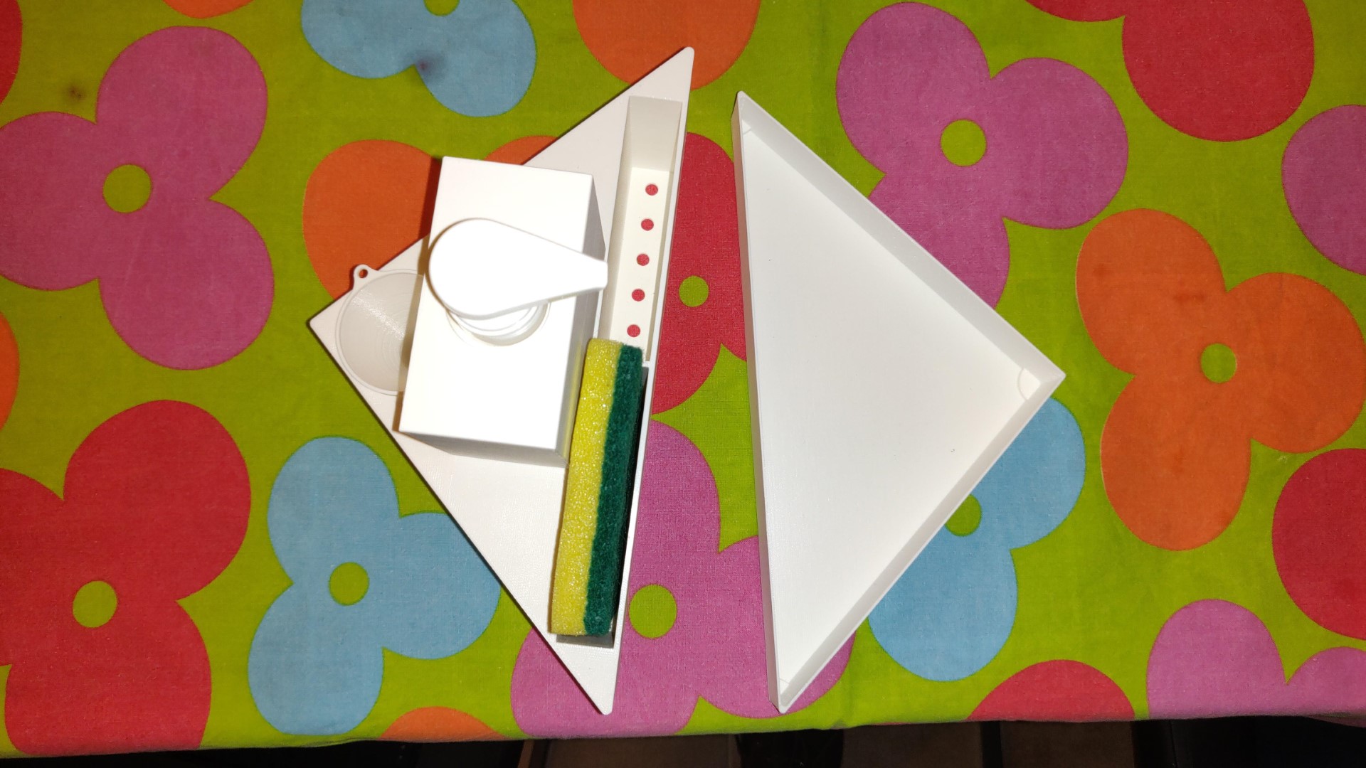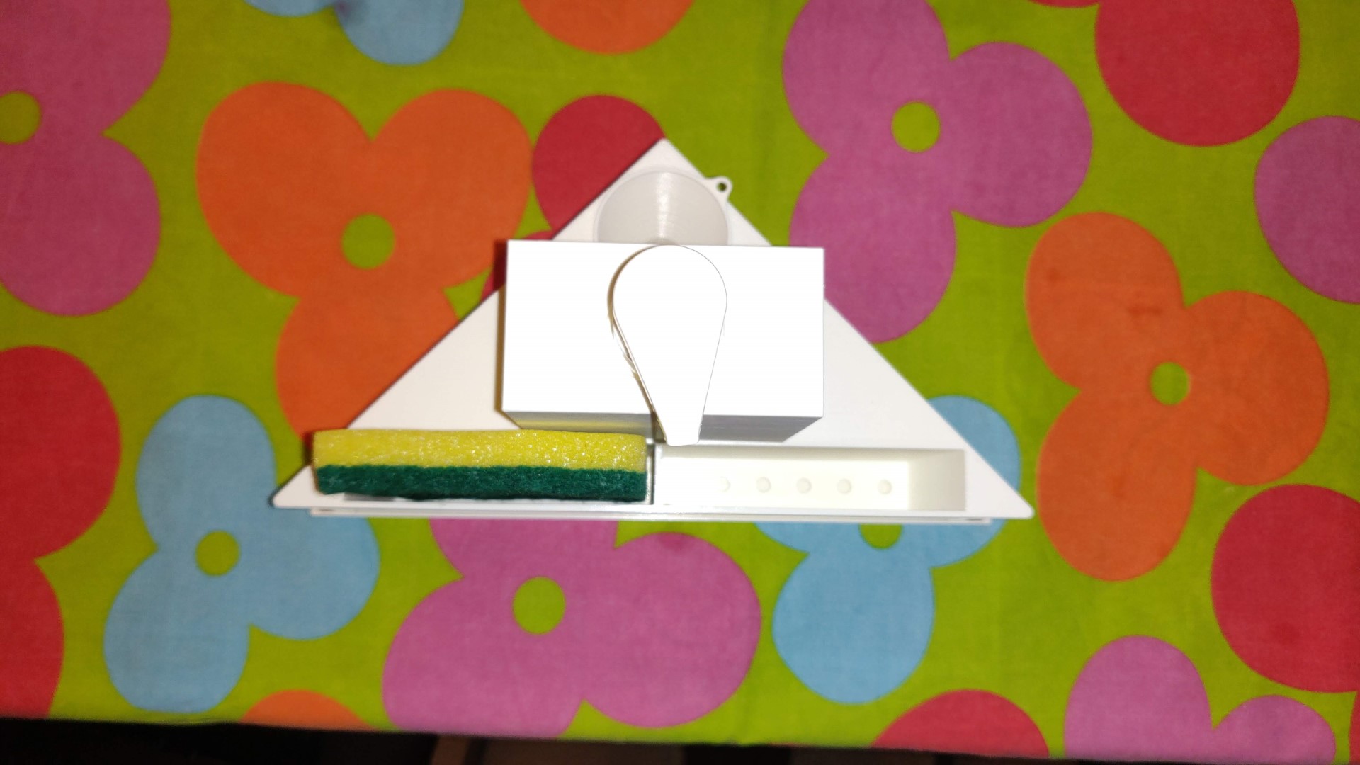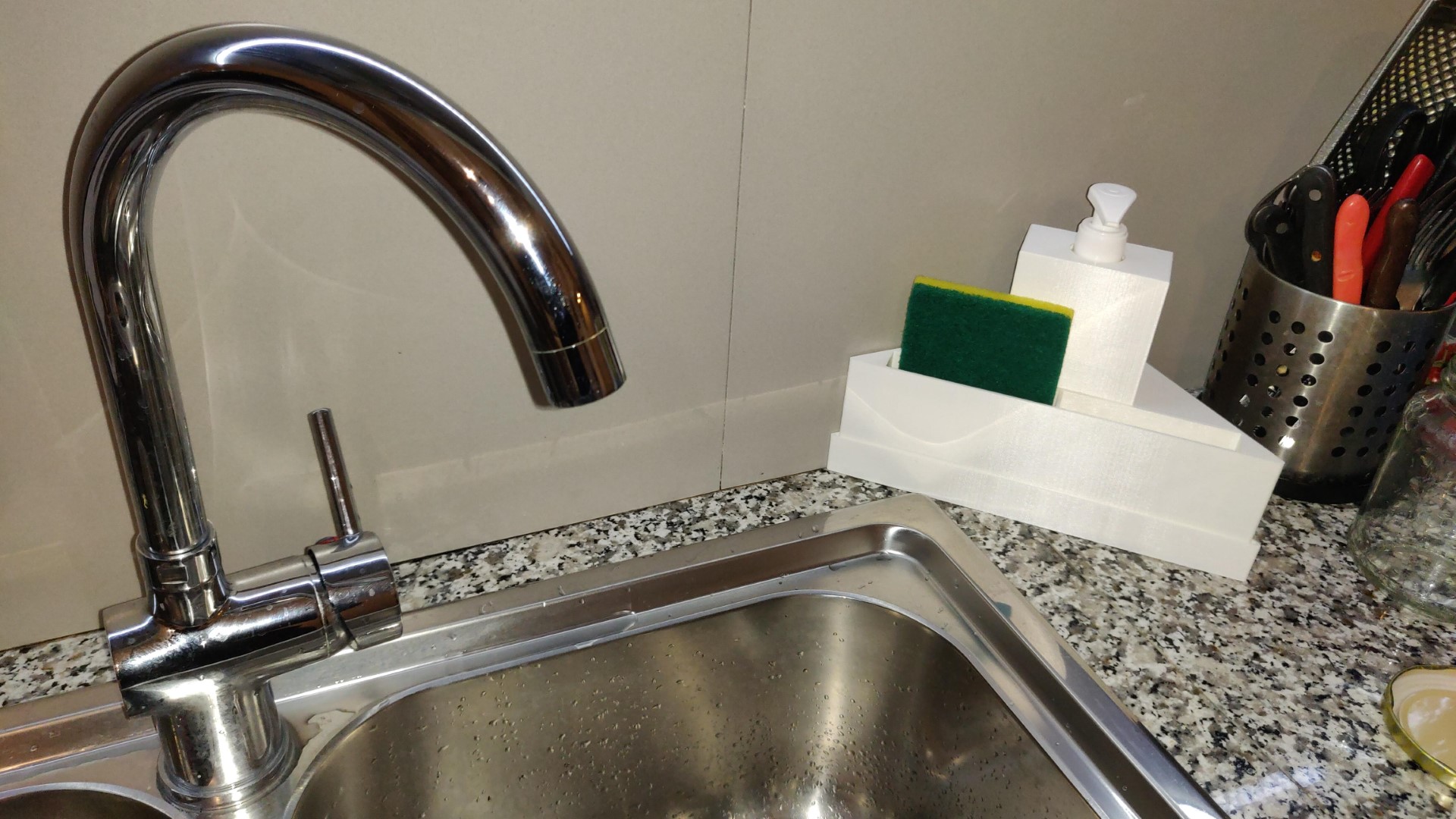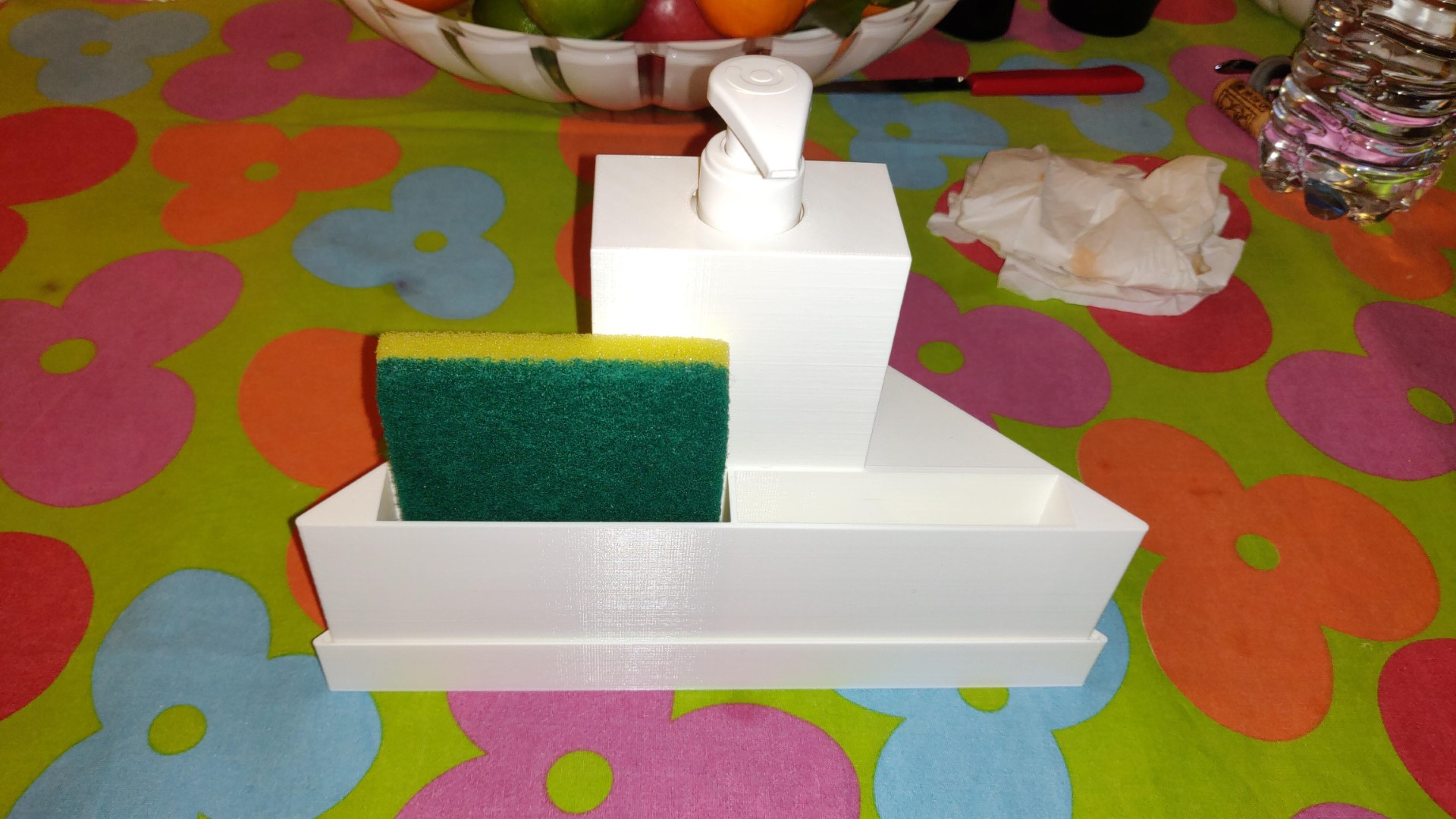 Un holder da cucina dove riporre spugne e sapone liquido. Il dispenser del sapone è ricaricabile. L'imbuto, incastrato all'interno dell'holder, facilita la ricarica. Le spugne hanno la possibilità di gocciolare l'acqua tramite i fori nell'apposito cassetto sotto l'holder.